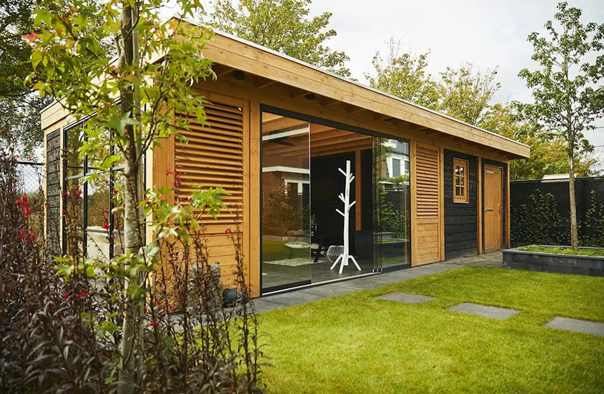Ben je op zoek naar een modern buitenverblijf met warme uitstraling? Neem eens een kijkje bij dit project. De constructie is vervaardigd van geschaafd douglas, wat samen met glazen wand en shutters die open en dicht kunnen voor een eigentijdse uitstraling zorgt. De diepe kleur van het hout en het klassieke Zweeds rabat geven het buitenverblijf nét wat extra warmte.